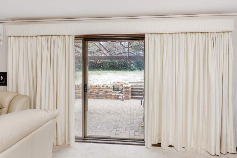 Here we had a situation where there is a large sliding door with a small window beside it. The pelmet and hand-drawn curtain was chosen for the slider, however, the client felt that a curtain did not suit the small window. There is a stair way above which prevented a pelmet being fitted at the same height as the other pelmet.